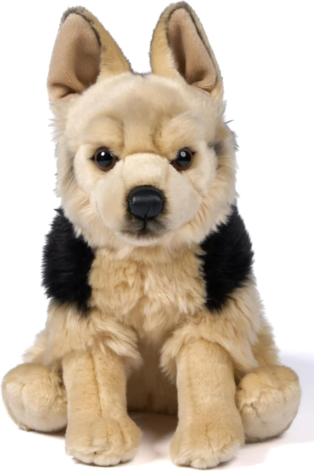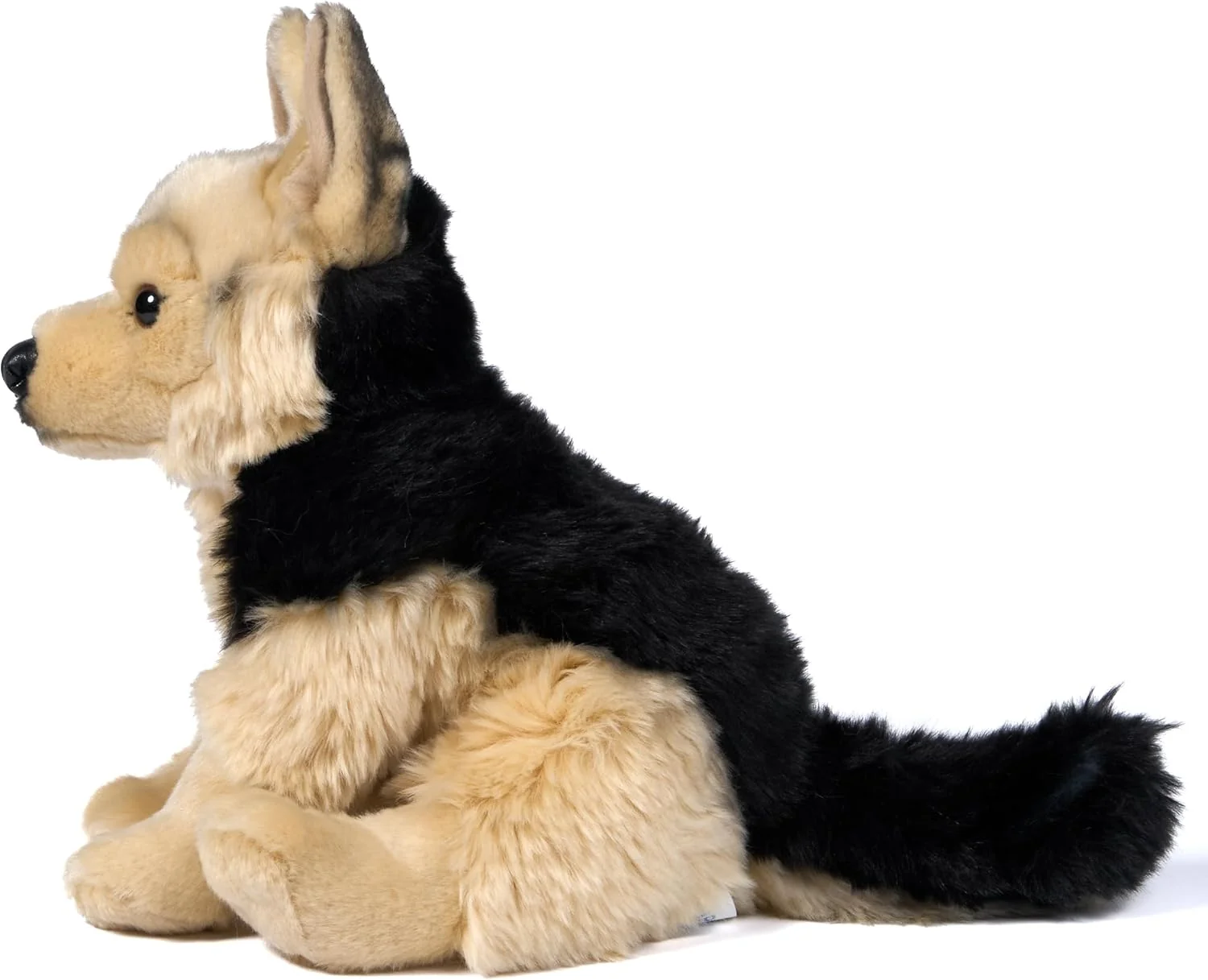 Ten owczarek niemiecki wyróżnia się charakterystycznym czarno-jasnobrązowym umaszczeniem, wyrazistym spojrzeniem, stojącymi uszami oraz harmonijną sylwetką, która nadaje mu realistyczny i spokojny wygląd. To maskotka idealna zarówno do zabawy, jak i jako element kolekcji psich ras.