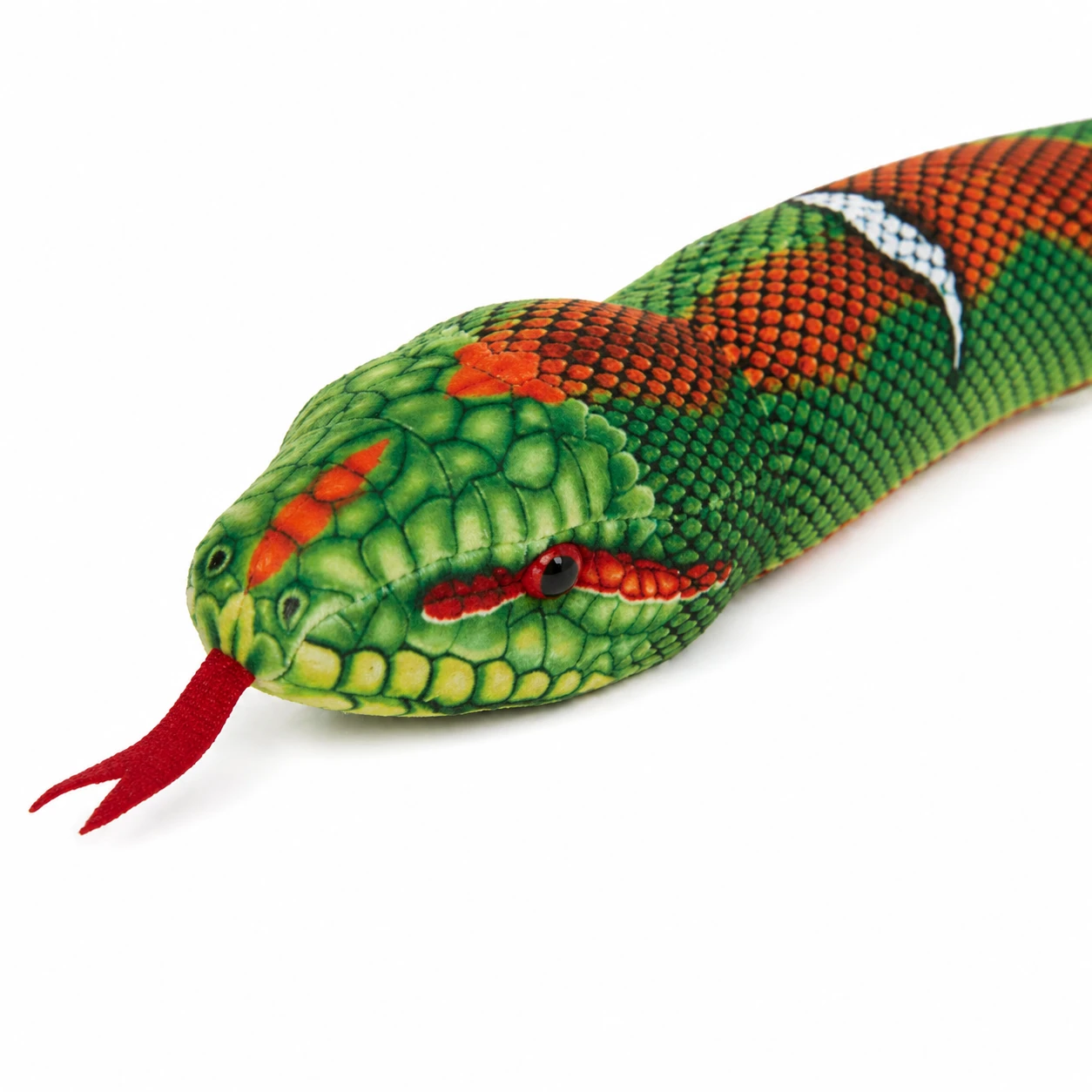 Ten pluszak węża od Beppe wyróżnia się imponującą długością i wyrazistą kolorystyką. Zielono-pomarańczowe wzory oraz detaliczny nadruk łusek nadają mu egzotyczny wygląd, który przyciąga uwagę i sprawia, że maskotka prezentuje się bardzo efektownie.